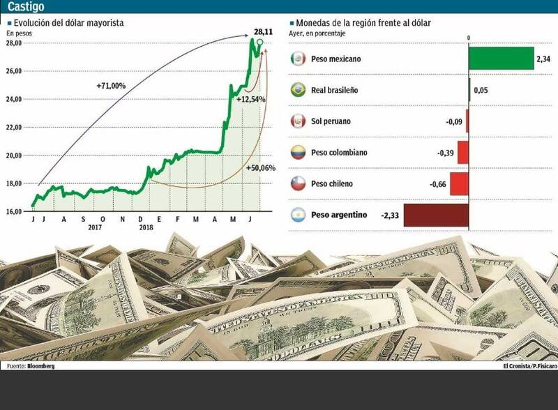 El dólar minorista se disparó ayer casi 63 centavos a $ 28,68, muy cerca de su récord nominal histórico de mediados de mes. En un día en el que siguió el castigo a activos de mercados emergentes, con particular virulencia en el caso argentino, fue importante la demanda de divisas por parte de inversores financieros y récord el volumen operados en el mercado de futuros, algo propio de un fin de mes pero exacerbado por la incertidumbre financiera. El Banco Central (BCRA) licitó u$s 150 millones de la asistencia del FMI al Tesoro para ayudar a abastecer a la demanda, al tiempo que renovó u$s 750 millones de sus posiciones en futuros de dólar, de junio a julio, para evitar que se disparen las expectativas de devaluación.