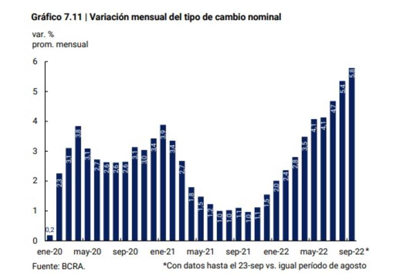 El Banco Central viene incrementando el ritmo de devaluación todos los meses. Así mientras en enero pasado el ritmo de devaluación mensual fue del 2%, en septiembre alcanzó el 5,8%.