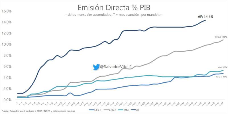 De acuerdo con Salvador Vitelli, analista de Romano Group, la emisión monetaria acumulada durante la presidencia de Alberto Fernández representa el 14,4% del Producto Bruto Interno (PBI), muy por encima del 10,8% del segundo mandato de Cristina Kirchner y casi el triple del que hubo durante la gestión de Mauricio Macri, cuando fue de 5,3 por ciento.
