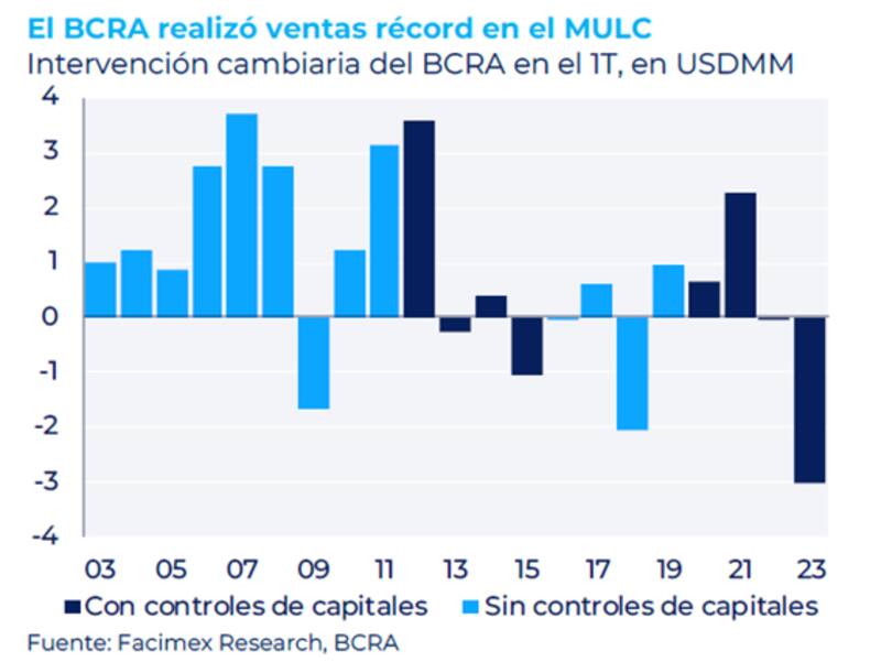 "El BCRA cerró el primer trimestre del año con ventas por u$s 3100 millones, el peor registro en la serie histórica con datos desde 2003. Esto motivó un desplome de las reservas netas que según la metodología del FMI, cerraron marzo u$s 5400 millones, por debajo del nivel de diciembre y quedaron incluso casi u$s 2000 millones por debajo de la meta revisada tras la cuarta revisión del programa", detalló.