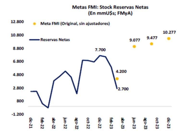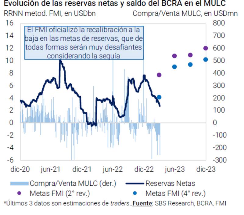 "Consideramos que la meta de reservas del primer trimestre de 2023 no fue cumplida, aún recalibrada, y que, dado el panorama comercial 2023, se requerirá de desembolsos con organismos internacionales para intentar acercarse al resto de las metas, que creemos bien podrían recalibrarse nuevamente a la baja (o solicitar waivers) considerando que el impacto de la sequía no fue totalmente actualizado por el FMI en la última revisión", estimó.