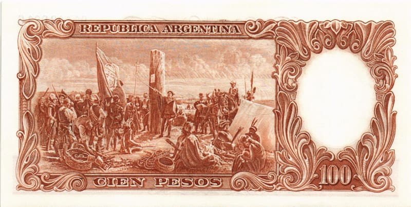 En la foto de presentación se muestra el dorso de un billete de $ 100, que tiene una imagen de la segunda fundación de la Ciudad de Buenos Aires que realizó Juan de Garay en 1580. El diseño oficial del mismo data de entre 1943 y 1969.