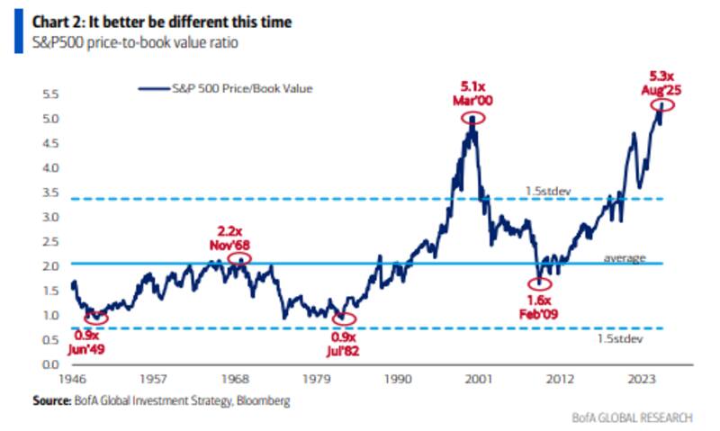 A esto se suma un ratio precio/valor contable en récord de 5,3x, impulsado por la ola de asignaciones "cualquier cosa menos bonos" y el boom de la inteligencia artificial.