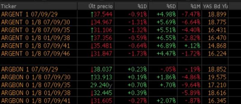 Sin embargo, los rendimientos aquí siguen siendo preocuapentes. El bono referencia, es decir el AL30D, tiene una TIR superior al 19%.