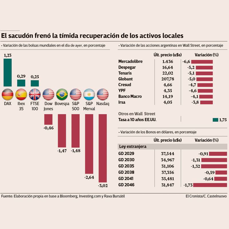 Los bonos argentinos venían encadenando una recuperación que duró cinco ruedas, pero la mejora se detuvo hoy en el marco de un pésimo día para los mercados. El sector bursátil sintió el golpe de un nuevo incremento en los rendimientos del bono a 10 años de Estados Unidos, que cerró la rueda en 1,75%.