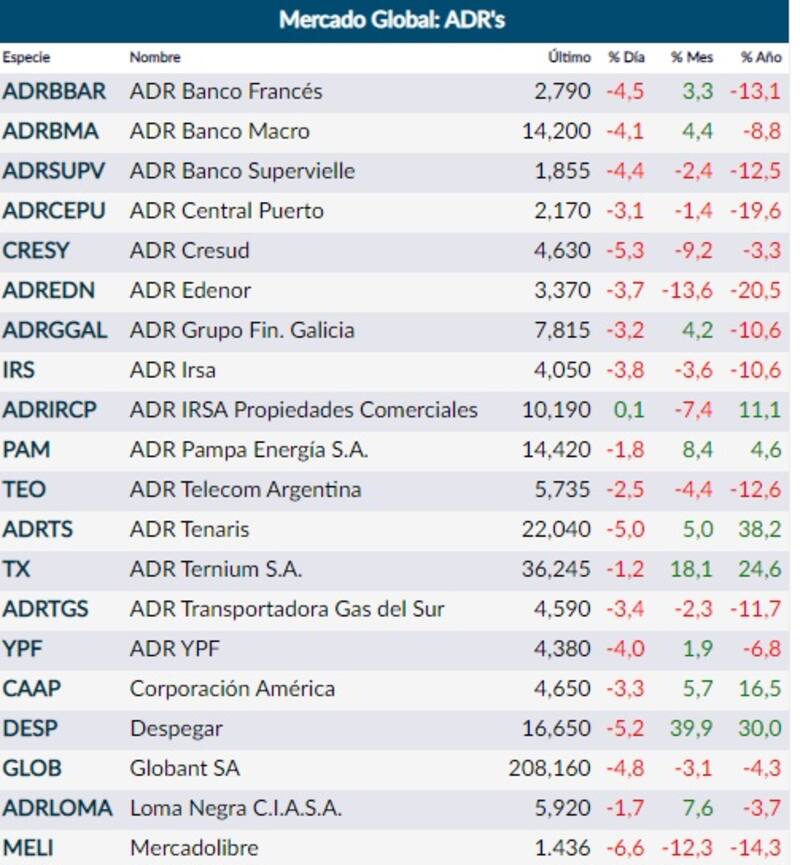 Las acciones de compañías argentinas no estuvieron exentas ante estos sacudones, por lo que los ADR tuvieron una caída generalizada y la única vela verde del pizarrón fue la de Ternium (+0,9%). Las peores caídas las tuvieron Mercado Libre (-6,6%), Despegar (-5,2%), Tenaris (-5,1%), Globant (-5%), Cresud (-4,7%) e YPF (-4,6 por ciento).