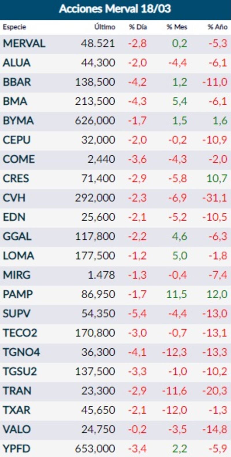 La Bolsa porteña performó de manera similar, con un Merval cayendo 2,6%, para ubicarse en 48.599 unidades. Absolutamente todas las acciones del panel líder mostraron retrocesos.