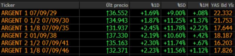 También mostraron alzas importantes los bonos ley New York en Wall Street. La más destacada es la del GD35, que subió 2,45 por ciento. En tanto, el GD30 ganó 1,87% en el día.