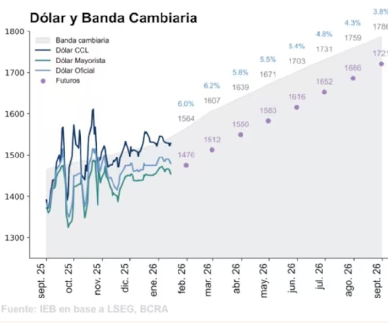 Para fin de febrero, el dólar futuro se ubica en $1512, saltando a $1550 para fin de marzo y $1583 para fin de abril. Finalmente, para septiembre, el dólar oficial alcanzaría los $1721, debajo de los $1786 de la banda superior.