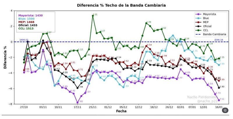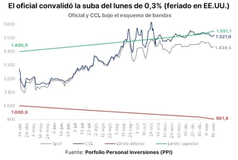Habiéndose conocido el dato de inflación de diciembre de 2,8%, de a poco la banda superior va tomando una mayor pendiente, haciendo que se aleje del valor actual del tipo de cambio.