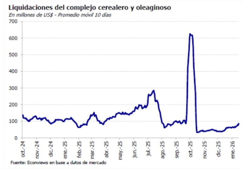 La liquidación del complejo cerealero y oleaginoso alcanzó los u$s 100 millones en promedio de los últimos 10 días y alcanza su mayor valor desde finales de octubre y comienzo de noviembre de 2025, luego de que el equipo económico haya permitido la liquidación del agro sin retenciones por hasta u$s 7000 millones en la previa electoral.