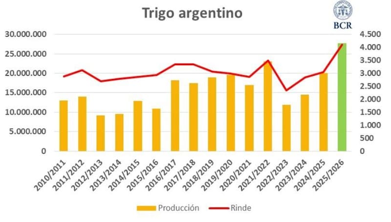 Para el trigo se espera algo similar. Para la cifra final de producción de trigo, según la bolsa de Comercio de Rosario, se la estimó en 27,7 Mt, por lo que la Argentina produciría en la campaña 2025/26 un 37% más de trigo que en el ciclo previo.