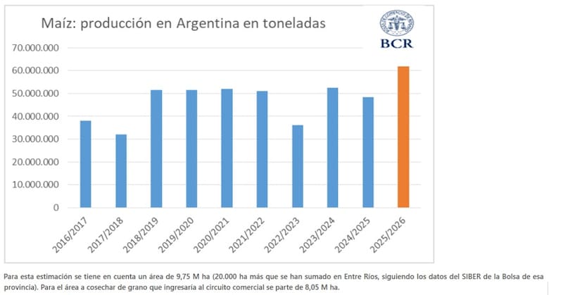 Según la Bolsa de Comercio de Rosario, la primera estimación de liquidación de maíz apunta a la posibilidad de obtener una producción récord de 62 Mt, superando por 1 Mt la proyección inicial. Este guarismo supera por 9,5 Mt al récord anterior (52,5 Mt en el 2023/24). Con respecto al ciclo pasado, el aumento de la producción sería de un 24%.