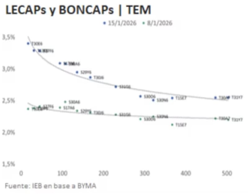 “Instrumentos como la Lecap a febrero (S27F6), con rendimientos en torno al 3,1% (TEM), lucen atractivos frente a una inflación que estimamos en 2,5% para enero, con una trayectoria descendente hacia febrero. La combinación de tasas altas, menor presión cambiaria y desinflación gradual mejora el carry esperado y reduce el riesgo de corto plazo”, dijeron.