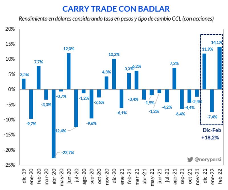 De acuerdo con Nery Persichini, jefe de estrategia de GMA, el rendimiento del carry trade en febrero fue de 14,1%, el más elevado desde el inicio del gobierno de Alberto Fernández, como consecuencia de las subas de tasas y la baja de los dólares financieros, por lo que se observó un pico en las ganancias de estas operaciones.