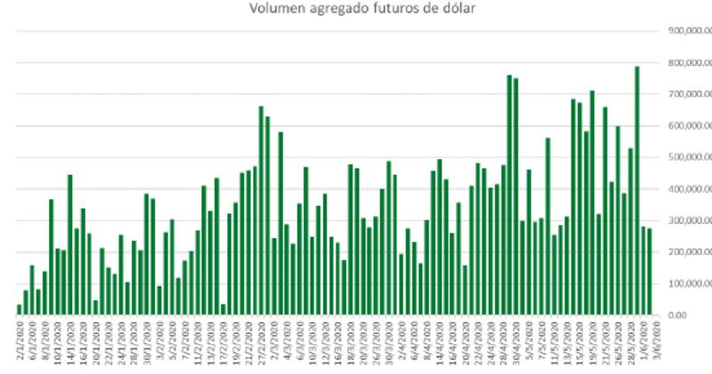 A partir de dicha resolución que impone nuevos controles para el acceso de cambios y la publicación de la resolución A7030, el volumen de futuros cayó abruptamente, luego de que el viernes se haya visto un incremento del volumen por rolleo de posiciones dado que el viernes vencía el futuro.