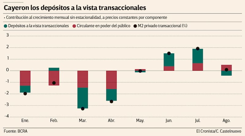 Asimismo, en términos reales y ajustados por estacionalidad, los medios de pago (M2 privado transaccional) se mantuvieron prácticamente sin cambios en agosto, luego de tres meses consecutivos de aumento. "Este comportamiento se explicó por la caída de los depósitos a la vista transaccionales, que fue compensada por una suba del circulante en poder del público", consigna el informe del Banco Central.