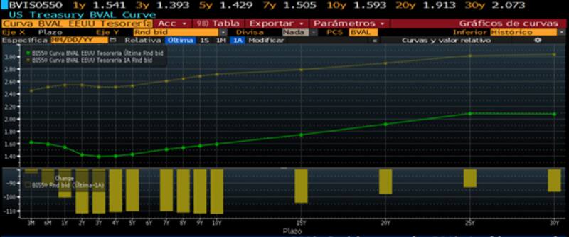 La curva de rendimientos americana mostró una caída de más de 100 a 110 puntos básicos para la parte corta y media mientras que en la parte más larga cayó 95 puntos básicos. Cuando hace un mes toda la curva mostraba pendiente positiva. Actualmente, el tramo corto y medio se muestra con pendiente negativa, típico síntoma de que el mercado vislumbra riesgos recesivos.