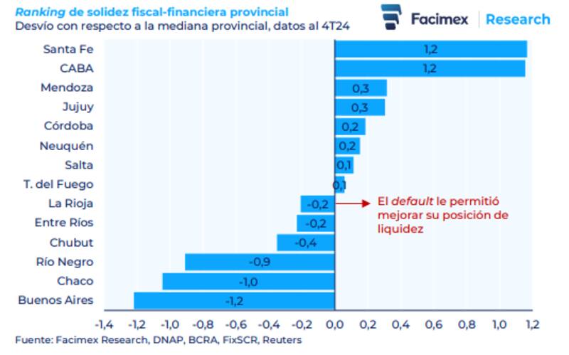 En el ranking de Facimex, basado en 10 indicadores fiscales, de apalancamiento y liquidez, estandarizados y ponderados para reflejar su posición relativa, Santa Fe y la Ciudad de Buenos Aires lideran el listado, seguidas por Mendoza, Jujuy y Córdoba,. En el otro extremo, Buenos Aires, Chaco y Río Negro muestran la mayor fragilidad fiscal-financiera.