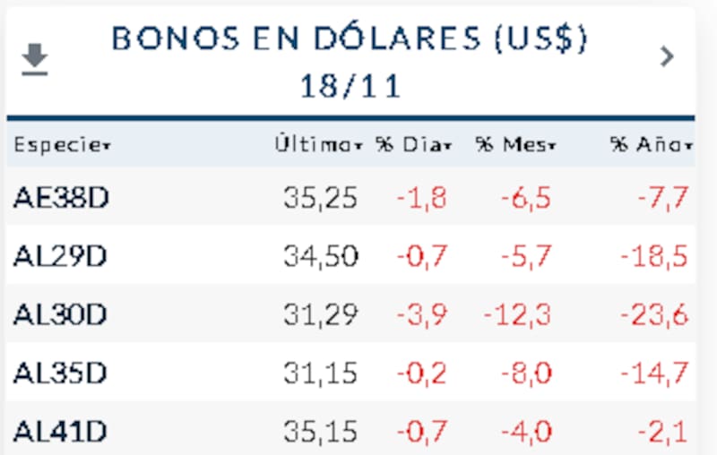 En este contexto, el AL30D cayó hoy 4,05% y lleva una baja del 12,64% desde que pasaron las elecciones. De esta forma, el instrumento más operado de ByMA arroja un valor de u$s 31,29.