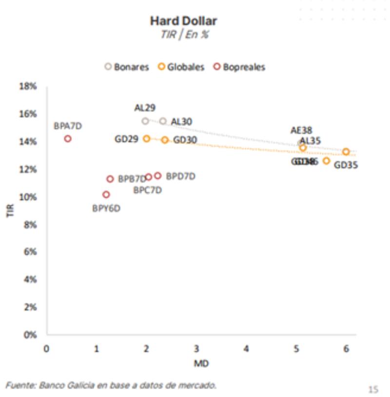 "Los únicos bonos puramente hard dolar que vencen completamente en la gestión Millet son los Bopreal y en particular el Serie 3, con vencimiento a mayo del 2026. Este opera con una paridad de 90% y tiene una TIR de 11%. También está el Bopreal Strip D, que tiene una paridad del 85% y una TIR del 12%", sostuvo.