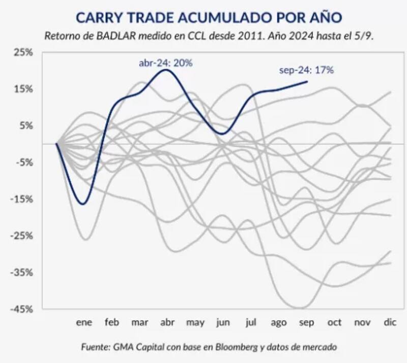 Nery Persichini, head de estrategia de GMA Capital, agregó que las elevadas tasas nominales en pesos de nuestro mercado (que compiten contra una inflación en descenso, pero aún de magnitud) han llevado a un nuevo período exitoso de carry trade.