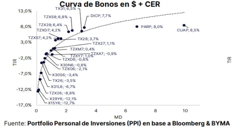 A su vez, la curva CER muestra retornos reales negativos de hasta -12% en el tramo corto, elevándose a niveles de 0% para bonos a 2027 y 2028 y alcanzndo valores de 8% a 8,5% en los extremos mas largos de la curva.