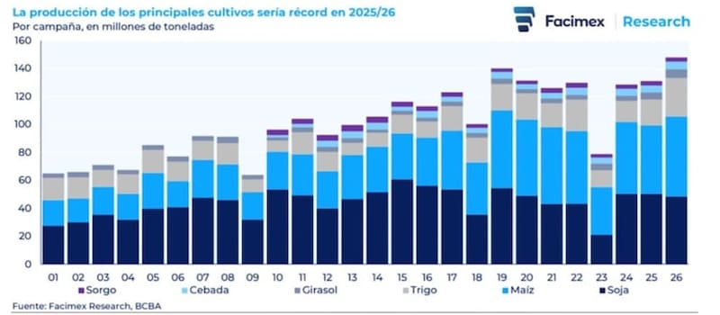 Las estimaciones de la Bolsa de Cereales de Buenos Aires apuntan a que, entre el sorgo, la cebada, el girasol, el trigo, el maíz y la soja, la campaña de 2025 y 2026 alcance los 150 millones de toneladas.