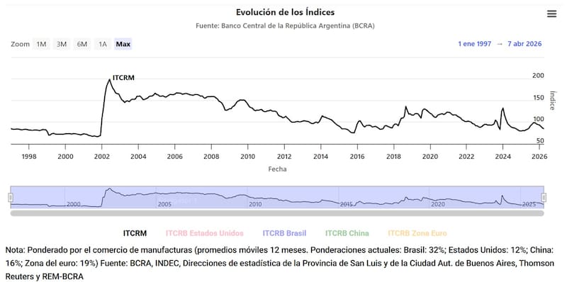 El índice de Tipo de cambio real multilateral se ubica en 85 puntos, siendo el nivel más bajo desde mediados de 2024 y en valores similares a los de 2016.