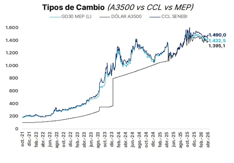 En lo que respecta al tipo de cambio financiero, el dólar MEP cae 0,8% hasta los $ 1418, mientras que el contado con liquidación cae 0,6% hasta los $ 1476.