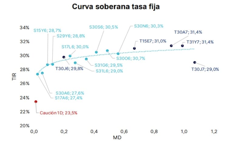Los rendimientos en pesos se encuentran ajustados, con las tasas de los bonos a tasa fija en niveles debajo del 31% (TNA) a lo largo de la curva, lo cual implica rendimientos del 2% (TEM) en promedio.