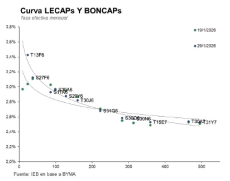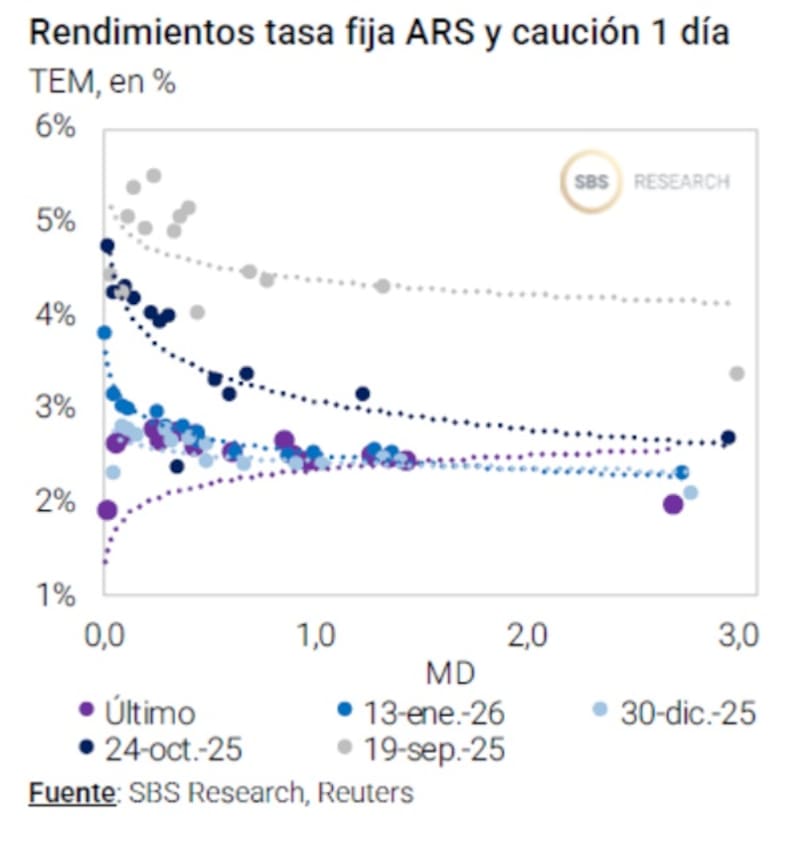 “La combinación de tasas efectivas mensuales elevadas y una calma cambiaria sostenida permite capturar rendimiento real atractivo con bajo riesgo de duration. En ese sentido, destacamos la Lecap a febrero (S27F6) con tasas 2,9% (TEM) y marzo (S16M6) con tasas 2,95% (TEM), que continúan mostrando una relación riesgo retorno interesante para posicionamientos tácticos en el tramo más corto de la curva”, afirmaron.
