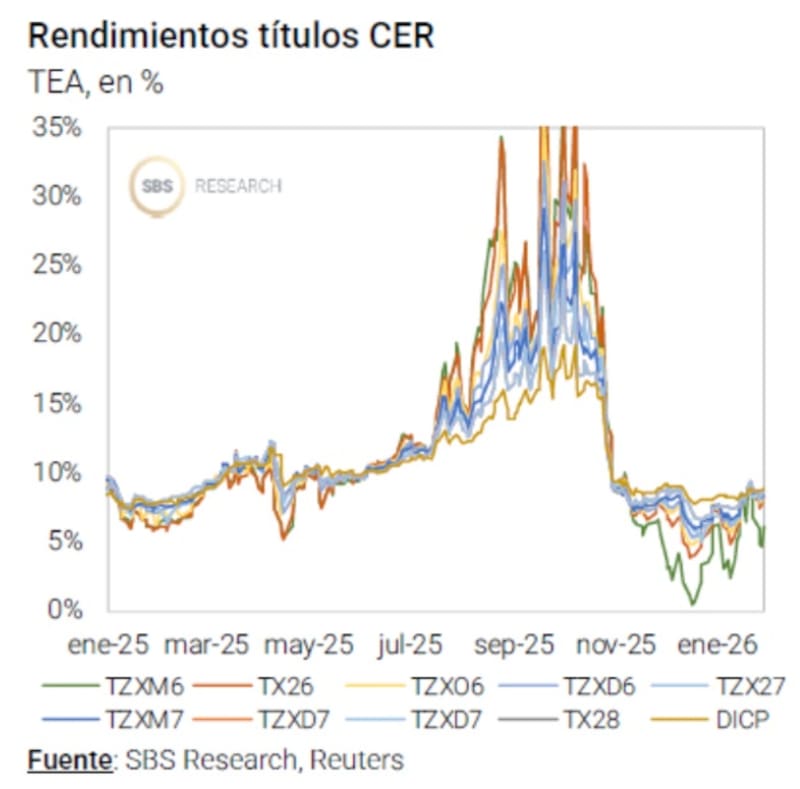 “Si la inflación de enero se confirma (estimado en 2,5% - 2,6%), los bonos que ajustan por CER siguen siendo el pilar de cualquier cartera en pesos. Los bonos CER cortos son la apuesta ideal, especialmente el Boncer que vence el 31 de marzo (TZXM6). También sumamos el Boncer a junio (TZX26) y a noviembre (TX26).