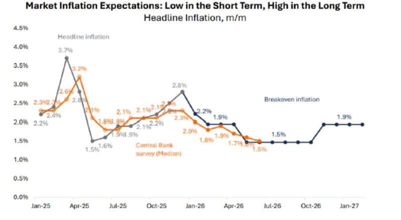 En esa línea, desde Research Mariva explicaron que las tasas de inflación de equilibrio actuales implican una inflación del 24 % para 2026, lo cual s eubica por encima de su proyección de 12,8 % para ese año, e incluso por encima del punto medio entre sus escenarios base y pesimista (20,9 %).