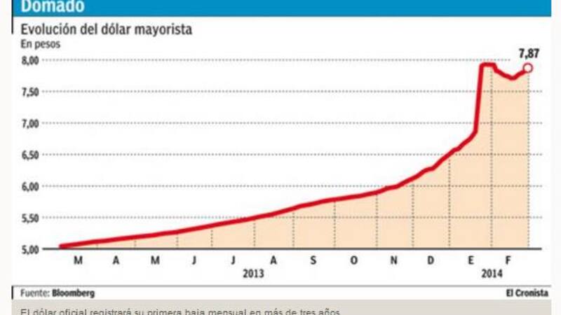 El dólar oficial se apresta a terminar la rueda de hoy con su primera baja mensual desde diciembre de 2010, hace más de tres años. El mayorista cayó 4 milésimas ayer, en una rueda accidentada, y quedó a $ 7,877. Tras saltar 23% en enero, el titular del Banco Central (BCRA) Juan Carlos Fábrega logró contener la corrida cambiaria forzando a los bancos a reducir su exposición a activos nominados en moneda extranjera, atrayendo más liquidaciones de exportaciones agropecuarias y pisando los pagos de importaciones. Las reservas, subieron ayer u$s 13 millones hasta u$s 27.645 millones, y quedaron u$s 103 millones por debajo del cierre de enero.