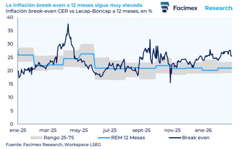 “La curva de tipo fijo (LECAP) no refleja plenamente el escenario desinflacionario que proyectamos, especialmente en vencimientos más largos, donde los rendimientos deberían ser significativamente inferiores. Las tasas de inflación de equilibrio actuales implican una inflación de alrededor del 27,7% para 2026, muy por encima de nuestra proyección base del 20,3%”, indicaron.