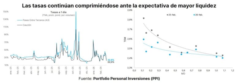 “Con una inflación proyectada en torno al 2,4% en febrero y el 2,5% en marzo, no prevemos una compresión significativa en el tramo corto de la curva. El Tesoro sigue favoreciendo una postura monetaria contractiva en lugar de una flexibilización agresiva de los tipos de interés. Así, para los inversores menos conservadores, preferimos las Lecap largas. Encontramos especialmente atractivos los bonos de mayor duración, como el T31Y7 y el T30J7”, dijeron.
