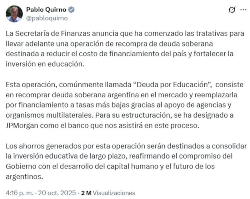 El Gobierno, a través del secretario del Tesoro, Pablo Quirno, informó el lunes que comenzaron las tratativas para llevar adelante una recompra de deuda soberana. Se trata de una iniciativa que propone cambiar deuda por educación.