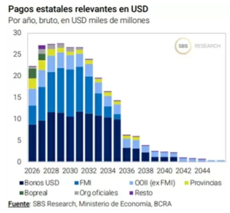 Algo similar vence en 2027, con u$s 2369 millones en enero de ese año y otros u$s 2881 millones a mitad de 2027.