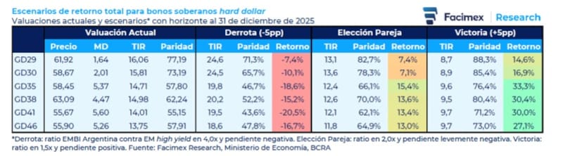 "Una convergencia inmediata a la curva implicaría un upside de entre +3% (GD29) y +24% (GD35) según el bono, mientras que un escenario más constructivo alineado con curvas B- o B+, elevaría el potencial a +34% promedio, destacándose el GD35 y GD41", afirmó.