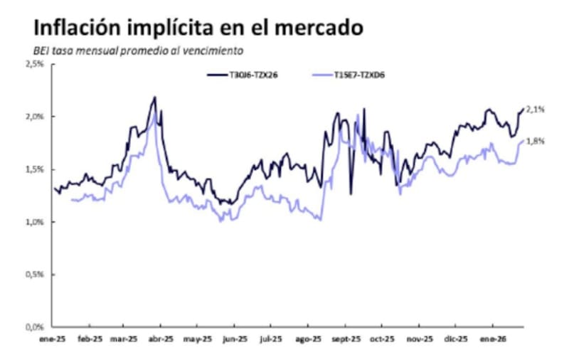 Al cierre del lunes, la inflación implícita para 2026 se ubicaba en 26,9%.