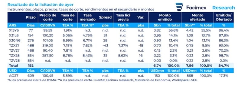 “Las Lecaps cortas venían explicando gran parte del monto adjudicado en las últimas licitaciones y que el 70% de los vencimientos correspondían a la Lecap S27F6. El Tesoro podría haber alcanzado un roll over superior al 100% ya que recibió ofertas por $8,0 billones (rechazó el 16% de las ofertas); aunque priorizó brindar una señal menos restrictiva, en línea con el accionar del BCRA en las últimas ruedas”, indicó Yarde Buller.