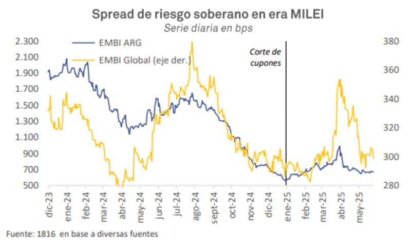 El riesgo país se encuentra en mínimos de 650 puntos, apenas 100 puntos básicos por encima del mínimo de enero pasado.