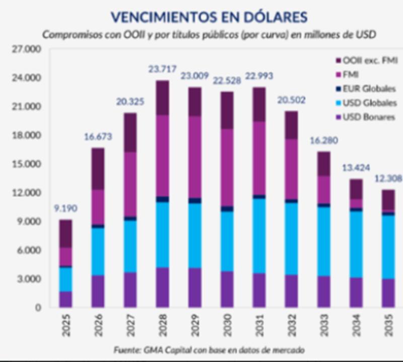 Los compromisos totales de la Argentina ascienden a u$s 20.325 millones en 2027, suben a u$s 23.717 millones en 2028. Recién bajan de los u$s 20.000 millones en 2032, por lo que el perfil de vencimientos luce bastante desafiante.