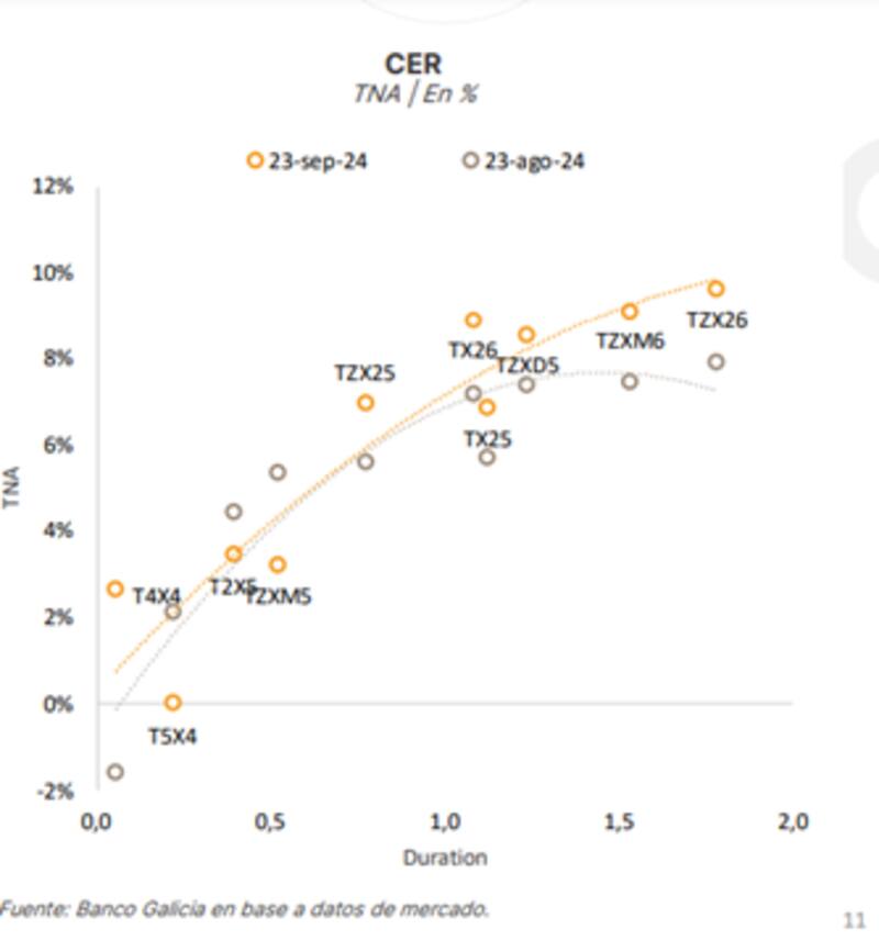 "Si bien la inflación últimamente se ha mostrado "viscosa", los datos de alta frecuencia para septiembre son favorables. Sin embargo, aun tomando una trayectoria benévola, como la del primer cuartil del REM del BCRA (septiembre y octubre en +3,1% y noviembre y diciembre en +2,9%), el rendimiento nominal esperado del CER T5X4 es similar al de la Lecap S13D4. Así, con este escenario, priorizamos colocaciones de corto plazo en CER", detalló.