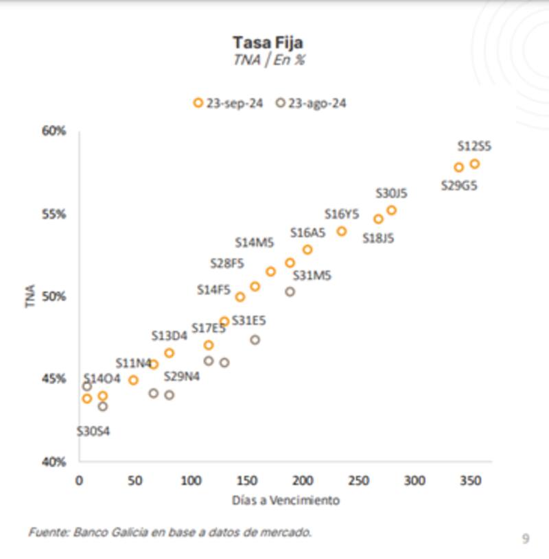 El tramo corto de la curva opera con tasas de 45% al 48% (TNA), saltando a niveles de 50% a 52% (TNA) en el tramo medio y de 57% a 60% (TNA) en los plazos más largos.