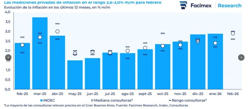 Tales relevamientos indican que el IPC de febrero podría situarse dentro de un rango del 2,6% a 3,0% mensual, con una mediana del 2,9% mensual, es decir, la mayoría de las mediciones privadas fueron similares al 2,9% m/m que reportó el Indec para enero.