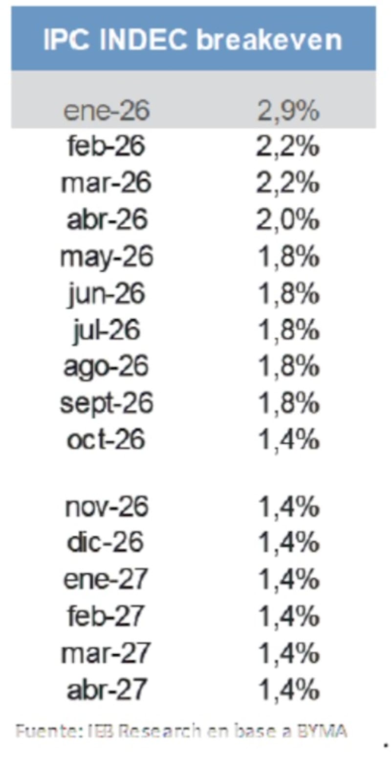 En relación a las expectativas de inflación incluidas en los precios, desde Research Mariva explicaron que los break even de inflación actuales implican una inflación de alrededor del 27% para 2026, lo cual se ubica muy por encima de sus proyecciones del 20,3%.