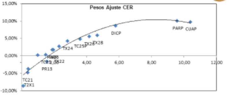 Las causas que generan dichas inconsistencias tiene un grado de dificultad de resolución tal que permiten proyectar que la disparidad entre la deuda en pesos y en dólares va a continuar hacia adelante. La incógnita es saber si el mercado va a tender hacia una normalización de la curva de dólares, apuntando hacia la normalización que ya presenta la curva CER (lo cual debería generar un rally en los bonos en moneda dura) o si en cambio, la curva CER se deterioraría apuntando a la dinámica negativa que ya se observa en la curva de dólar (lo cual generaría una caída en los bonos CER).