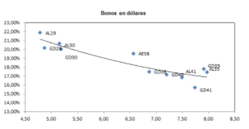 En cambio, la curva de deuda en dólares muestra a un país con grandes desequilibrios financieros y económicos ya que la misma se muestra invertida, con tasas en la parte corta en niveles de 22% y las tasas en la parte más larga por encima del 17%.